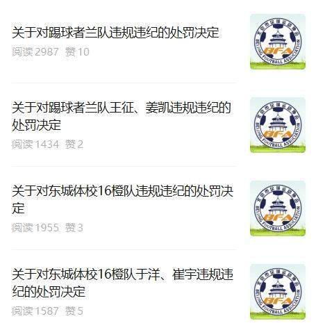 北京市足协发布处罚决定,中青赛北京赛区U10组东城体校16橙队和踢球者兰队在比赛中互射本方球门,消极比赛造成恶劣影响,均被取消赛事资格。北京足协的公告中表示:在东城体校16橙队vs踢球者兰队的比赛中,下半场比赛踢球者兰队连续射入本方球门3球,东城体校16橙队连续射入本方球门2球。两队的消极比赛造成恶劣影响,均被取消比赛资格,并被通报批评。此外东城体校16橙队主教练崔宇、领队于洋,踢球者兰队主教练姜凯、领队王征,也均被通报批评,并禁止参加北京市足球活动一年。